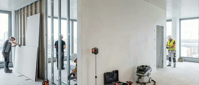 Moderne Wandsysteme im Trockenbau – schnell, sauber und präzise umgesetzt. Wir schaffen flexible Raumlösungen mit hochwertiger Verarbeitung und perfektem Finish. Effizient geplant, termingerecht gebaut und exakt auf Ihre Anforderungen abgestimmt.
